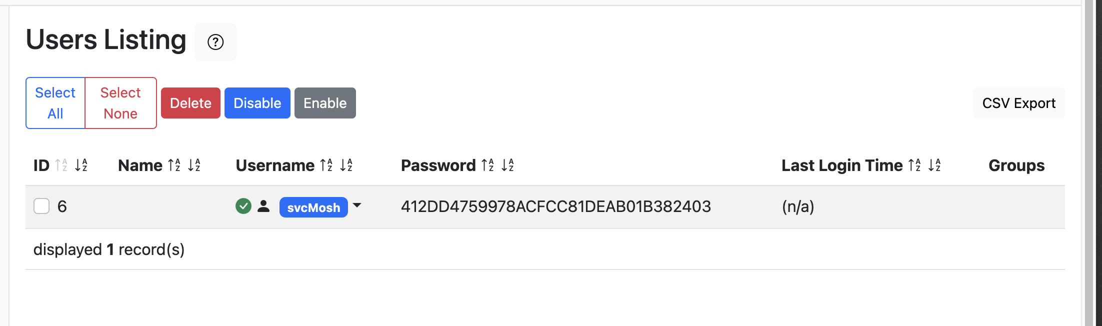 After a little bit of poking around, I found a page showing users and their hashed passwords. The svcMosh user had a hashed password that I could see, and it appeared that the hashing algorithm used was MD5. Perfect!